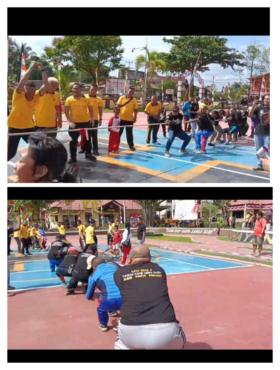 Suasana meriah mewarnai lomba tarik tambang dalam rangkaian kegiatan HUT RI ke-80 yang digelar di halaman Mapolres Melawi, Sabtu (16/8/2025). Sejumlah tim yang terdiri dari personel Polres Melawi hingga rekan media saling adu kekuatan demi memperebutkan gelar juara.