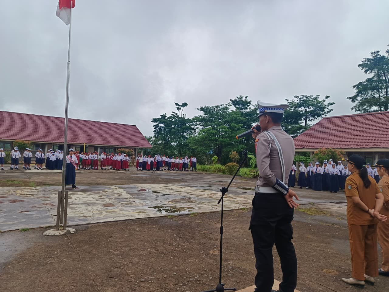 “Di sekolah, kalian belajar bukan hanya untuk menjawab soal ujian. Di sini kalian ditempa menjadi pribadi yang santun, jujur, disiplin, dan bertanggung jawab,” kata Aipda Yuni di hadapan seluruh peserta upacara.