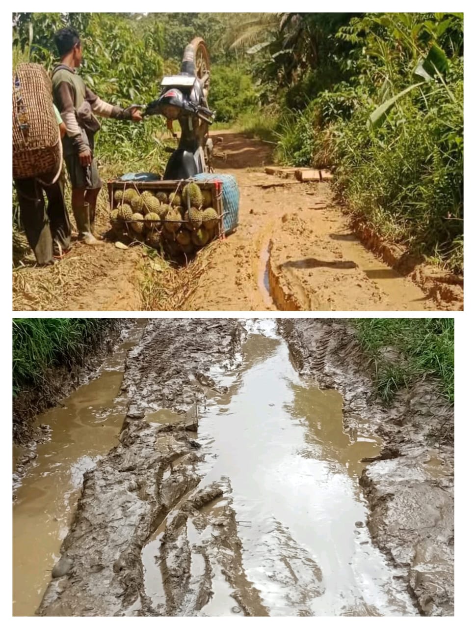 “Selain harga Sembako yang melambung tinggi, kami juga kesulitan untuk menjual hasil pertanian, tadi siang motor yang saya kendarai untuk mengangkut buah durian terbalik karena kondisi jalan yang semakin parah” tambahnya.