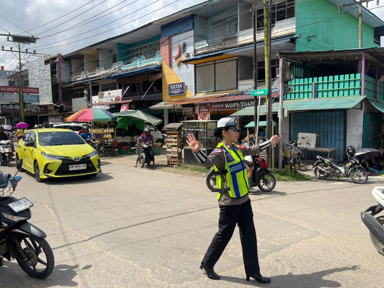 Di tengah kepadatan tersebut, sosok Polwan dari Satlantas Polres Melawi, Theresia Monikawati, terlihat sigap dan humanis menjalankan tugasnya. Dengan penuh kesabaran, ia mengatur arus kendaraan yang silih berganti melintas, sembari membantu warga yang hendak menyeberang jalan.