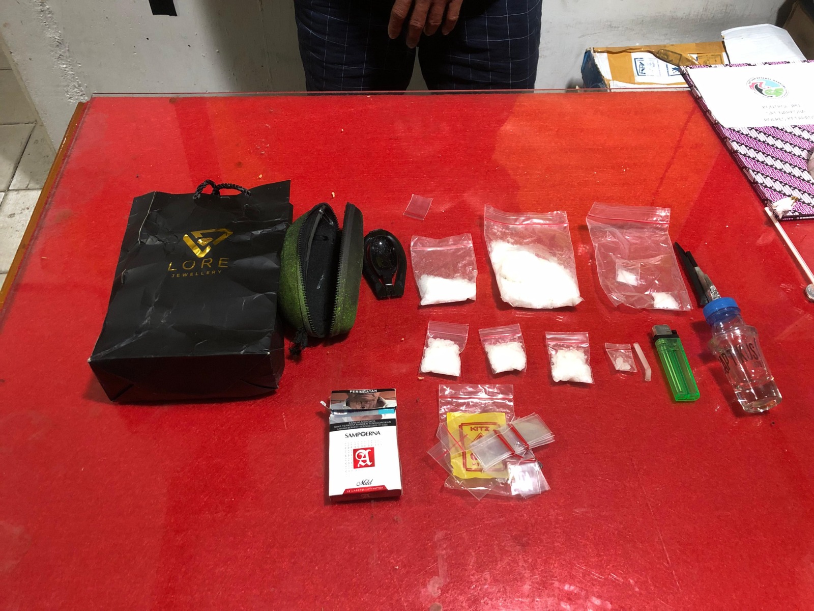 Dari hasil penggeledahan didalam mobil dan di badan terduga pelaku RS yang disaksikan petugas satpam dan beberapa warga sekitar, anggota Satnarkoba mengamankan sejumlah barang bukti berupa 8 kantong plastik klip transparan yang berisikan serbuk kristal diduga shabu dengan berat total 82 gram Brutto, 1 buah alat hisap shabu (bong), 1 sedotan sendok takar shabu, 1 bungkus kantong klip kosong dan 1 unit mobil Toyota Avanza Warna hitam.