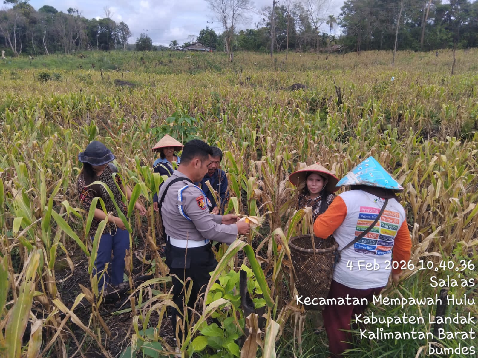 Mempawah Hulu – Dalam rangka mendukung program ketahanan pangan, Bintara Penggerak Desa Sala’as menghadiri kegiatan Panen Perdana tanaman jagung program 1 Desa 1 Hektar yang dilaksanakan di lahan milik Badan Usaha Milik Desa (BUMDes) Desa Sala’as, Kecamatan Mempawah Hulu, Kabupaten Landak.