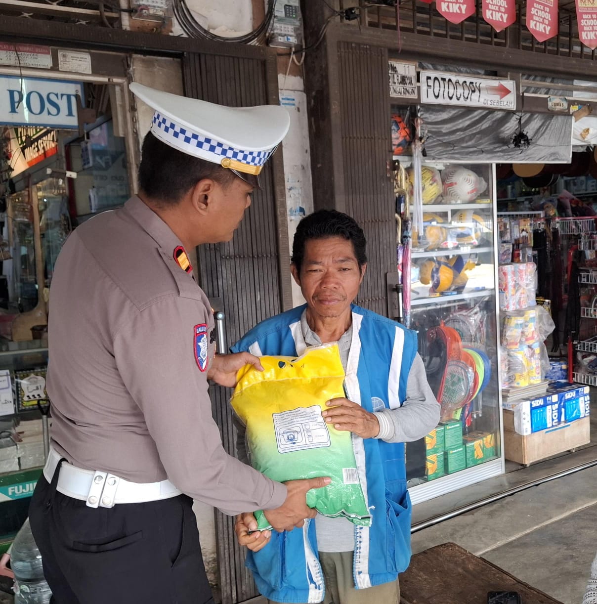 Selain membagikan paket beras, IPTU Sudarsono bersama personel Satlantas juga memanfaatkan kesempatan ini untuk berdialog santai dan menyampaikan pesan-pesan keamanan dan ketertiban masyarakat (Kamtibmas).
