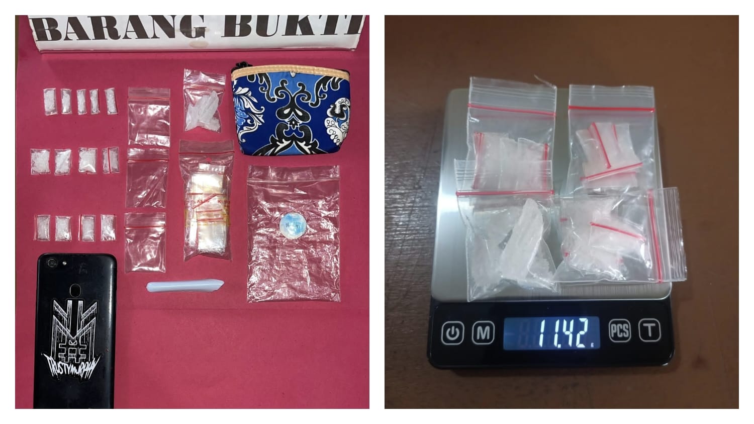 Saat dilakukan penggeledahan, petugas menemukan sejumlah barang bukti di ruang tengah rumah tersebut. Di antaranya satu unit handphone OPPO warna hitam lengkap dengan SIM card, serta satu dompet batik warna biru yang disimpan dalam lemari televisi. Di dalam dompet tersebut berisi: