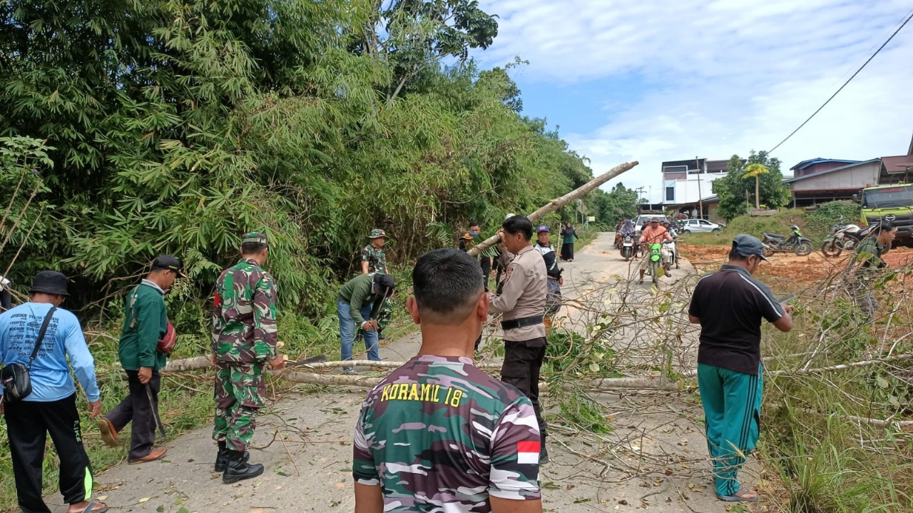 Warga Dusun Engkayak, Desa Nanga Mahap, Kecamatan Nanga Mahap, Sekadau, Kalbar, bersama aparat TNI-Polri bergotong royong menebang pohon di Jalan Riam Engkayak, Jumat (25/4/2025) pagi pukul 09.00 WIB.