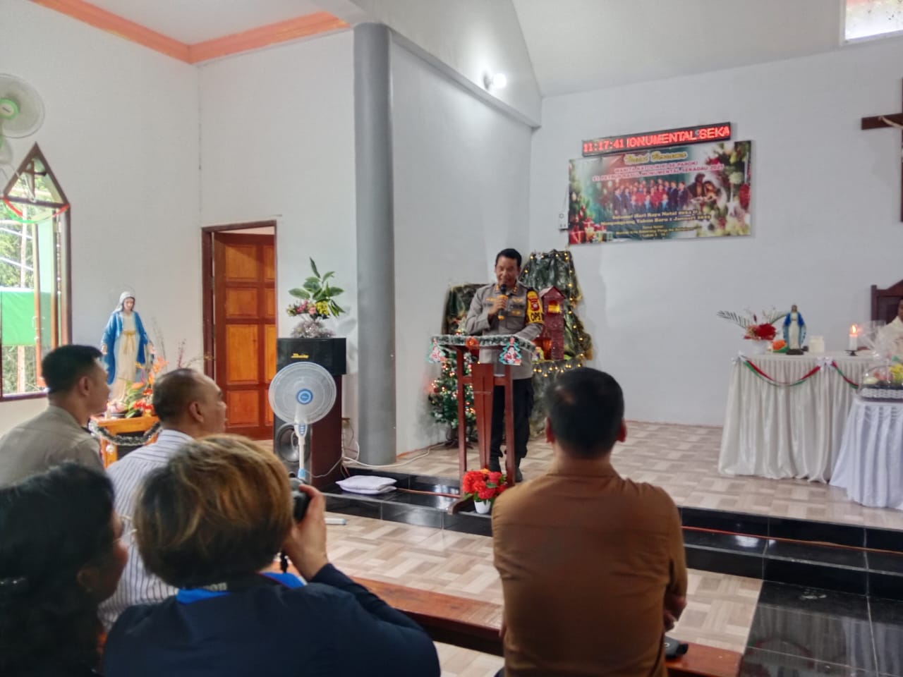 Kapolres Sekadau, AKBP Dr. I. Nyoman Sudama, S.I.K., M.Si., menghadiri perayaan Natal bersama Wanita Katolik Republik Indonesia (WKRI) se-Paroki Santo Petrus Rasul. Acara berlangsung di Gereja Katolik Santa Sesilia, Dusun Gonis Tekam, Desa Gonis Tekam, Kecamatan Sekadau Hilir, pada Minggu (5/1/2025).