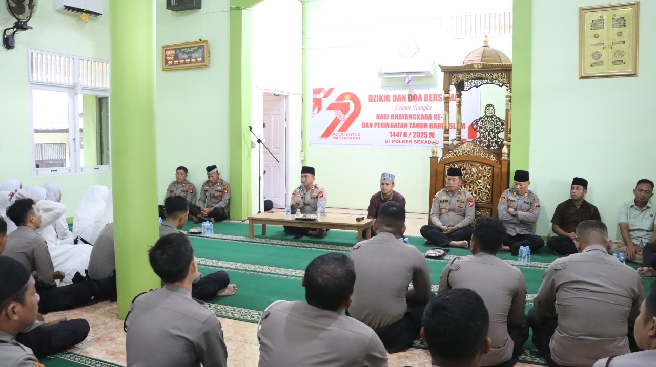 Polres Sekadau menggelar kegiatan dzikir dan doa bersama dalam rangka memperingati Hari Bhayangkara ke-79 dan menyambut Tahun Baru Islam 1447 H/2025 M. Acara yang berlangsung khidmat ini dilaksanakan di Masjid Ar Rahmat Polres Sekadau, Jalan Merdeka Timur, Rabu (25/6/2025).