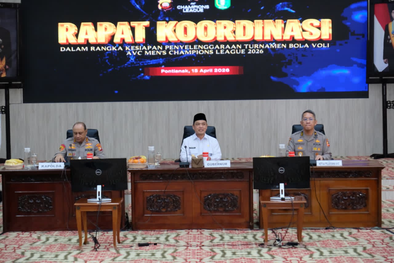 Kalimantan Barat bersiap menjadi pusat perhatian dunia olahraga Internasional. Kepolisian Daerah Kalimantan Barat bersama Pemerintah Provinsi Kalbar dan Instansi terkait menggelar Rapat Koordinasi (Rakor) persiapan penyelenggaraan Asian Volleyball Confederation (AVC) Men’s Champions League 2026 di Kantor Gubernur Kalbar, Rabu (15/4/2026) siang.