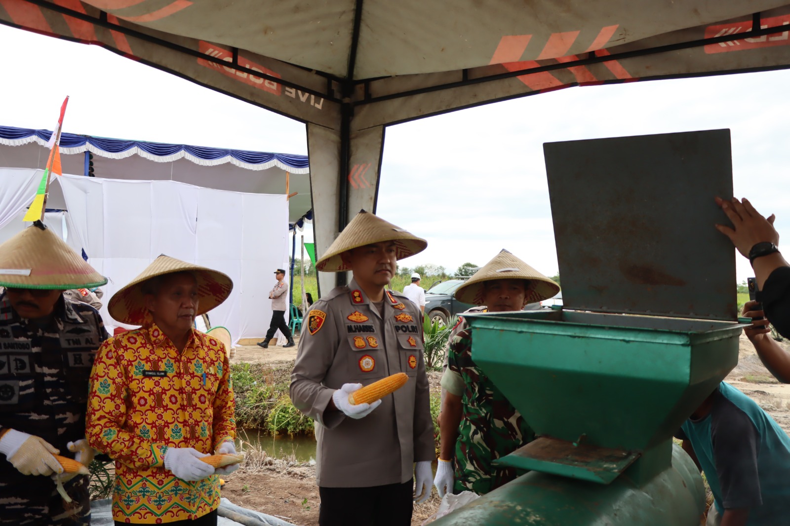 Kapolres Ketapang AKBP Muhammad Harris S.H., S.I.K., M.I.K., CPHR bersama jajaran Forum Koordinasi Pimpinan Daerah (Forkopimda) Kabupaten Ketapang menghadiri kegiatan Panen Raya Jagung Serentak Kuartal IV dalam rangka mendukung program Swasembada Pangan yang dilaksanakan di Kecamatan Muara Pawan, Kabupaten Ketapang pada Kamis (08/01/2026).