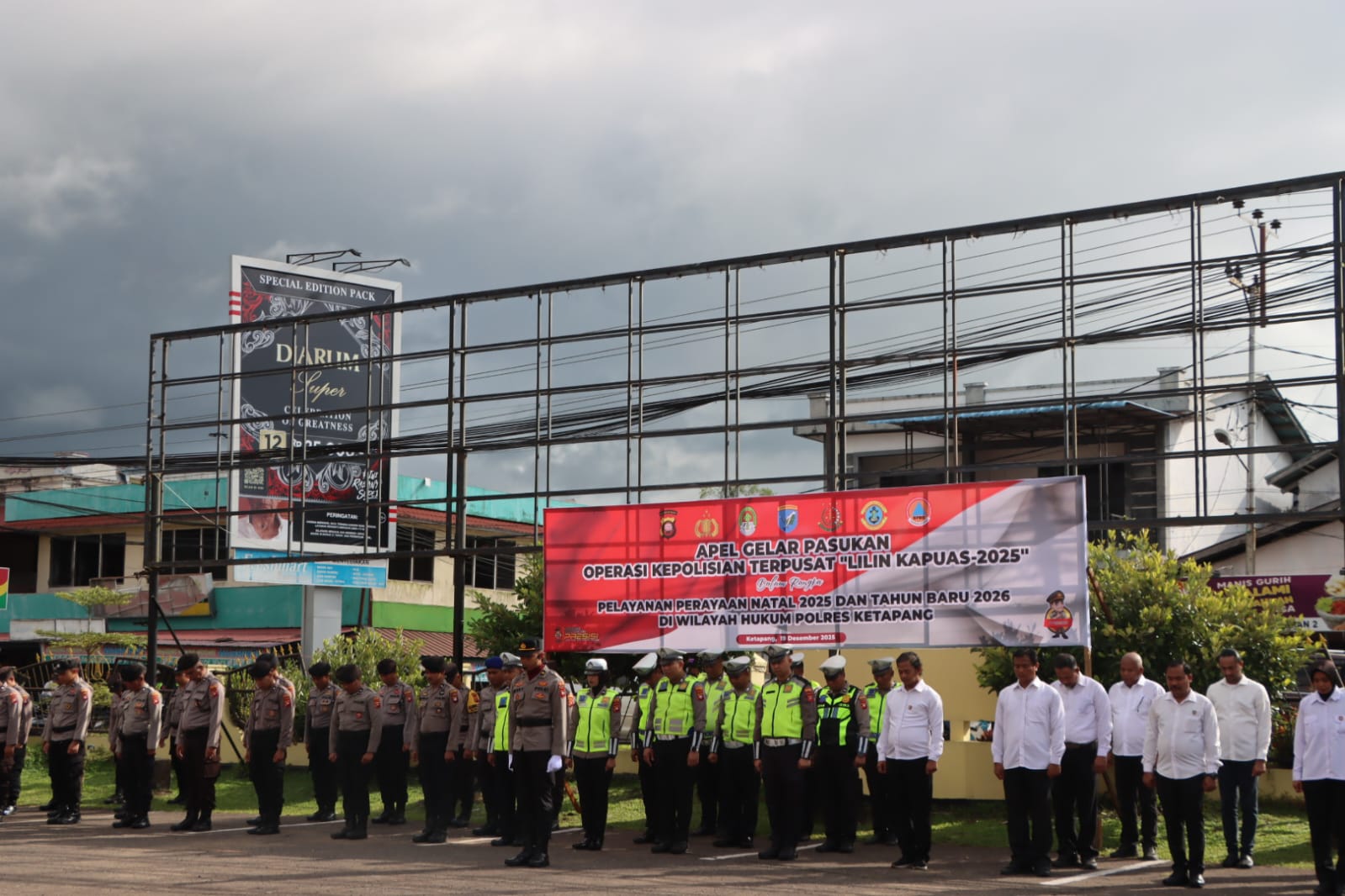 Kapolres Ketapang AKBP Muhammad Harris S.H., S.I.K., M.I.K., CPHR memimpin langsung pelaksanaan Apel Gelar Pasukan Operasi Lilin Kapuas 2025 yang digelar di halaman Mapolres Ketapang. Apel tersebut dihadiri oleh jajaran Forkopimda Kabupaten Ketapang sebagai bentuk sinergitas lintas sektoral dalam rangka pengamanan perayaan Natal 2025 dan Tahun Baru 2026 di wilayah Kabupaten Ketapang pada Jum’at (19/12/2025).