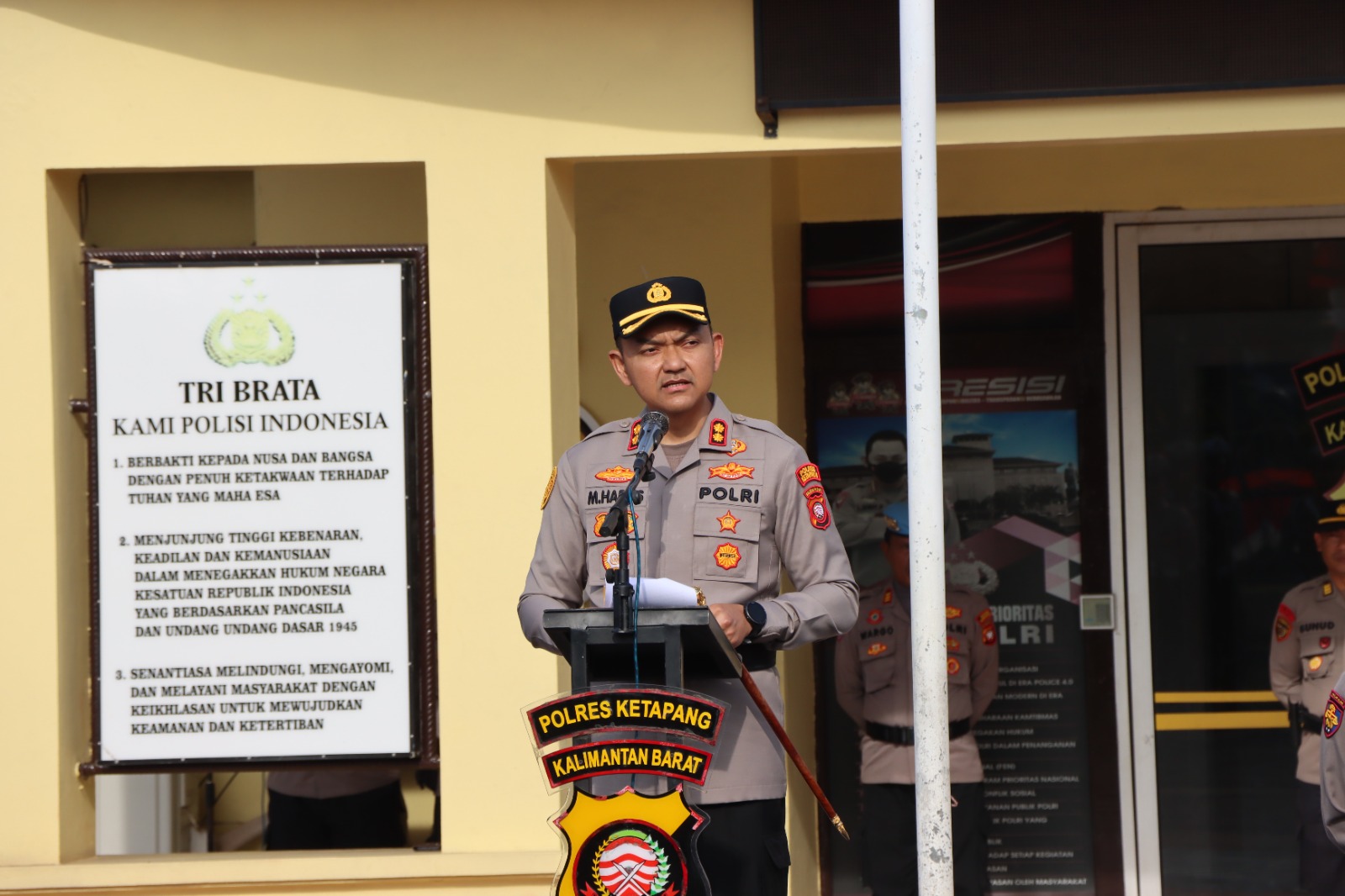 Kapolres Ketapang AKBP Muhammad Harris, S.H., S.I.K., M.I.K., CPHR memimpin langsung pelaksanaan Upacara Kenaikan Pangkat Penghargaan Bintang Bhayangkara Nararya 1 Personil atas nama Sunarto dari pangkat Aiptu menjadi Ipda yang digelar di halaman Mapolres Ketapang, Senin pagi (01/09/2025).