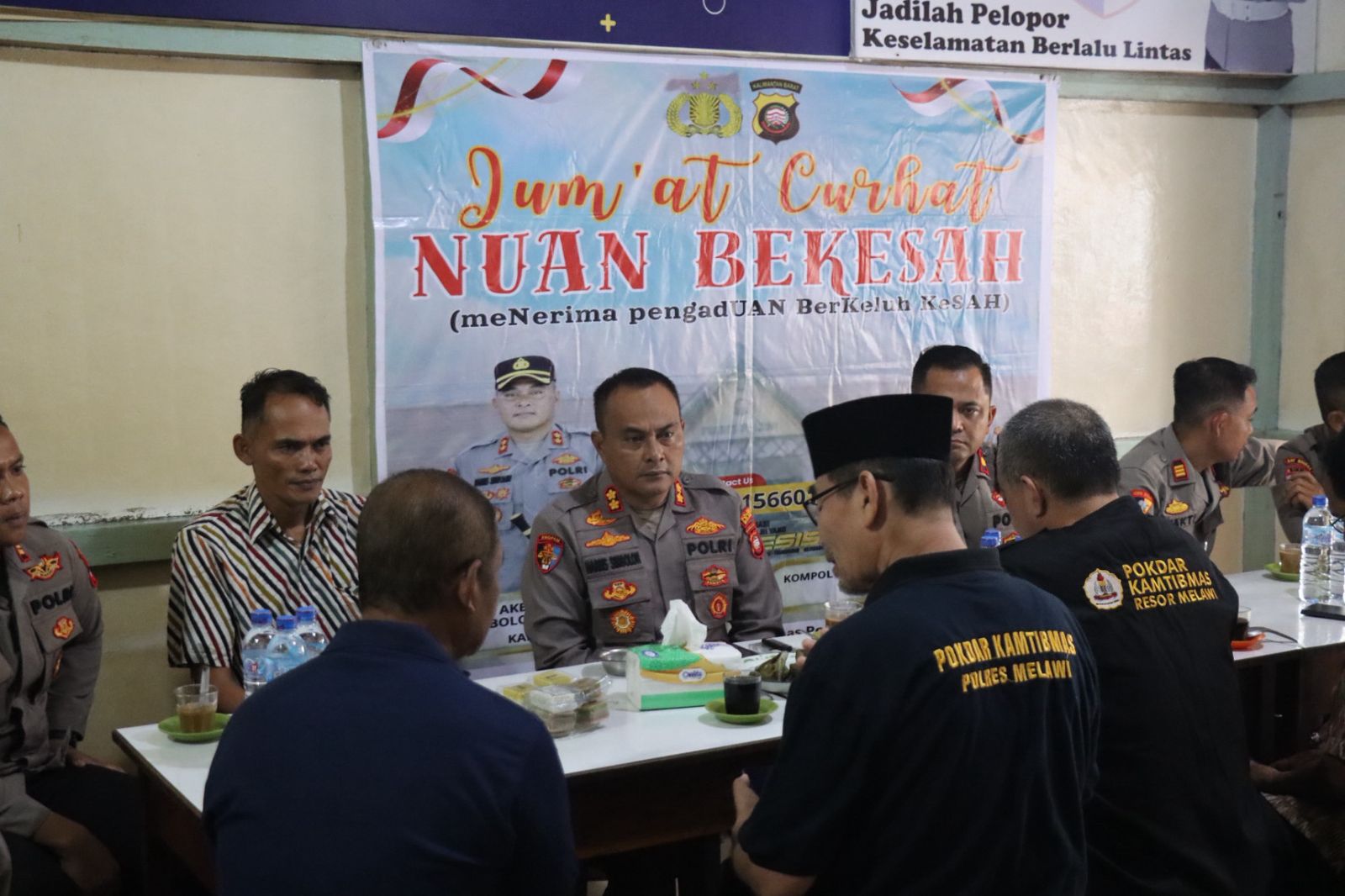 Kapolres Melawi, AKBP Harris Batara Simbolon, S.I.K., S.H., M.Tr.Ospla melaksanakan kegiatan Jumat Curhat dengan tema “Menerima Pengaduan Berkeluh Kesah (Nuan Bekesah)” di Warkop Sejuta Kawan Nanga Pinoh, Kabupaten Melawi, Jumat (31/10/2025).