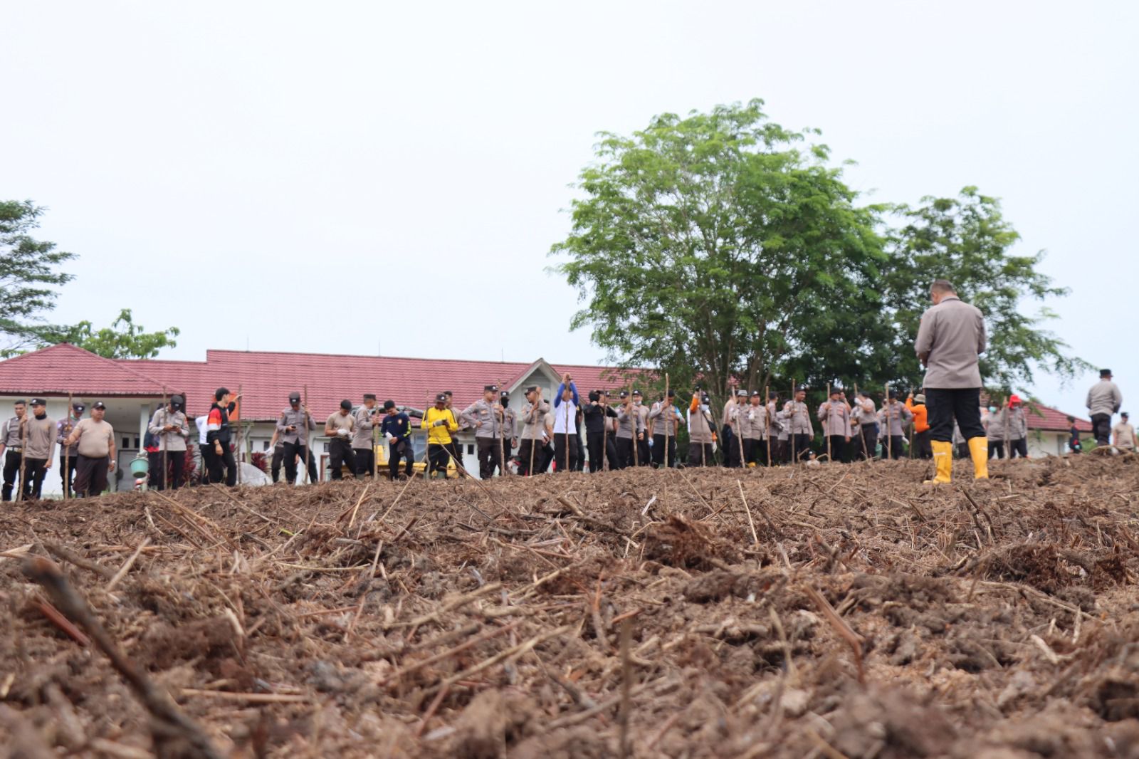 Kapolres Melawi pimpin 175 Personel mendatangi lokasi di belakang kantor Dinas Sosial Kabupaten Melawi, kedatang banyak personel ini guna melakukan penanaman jagung di belakang Kantor Dinas Sosial Desa Kelakik kecamatan Nanga Pinoh Kabupaten Melawi. Senin (5/5/2025).
