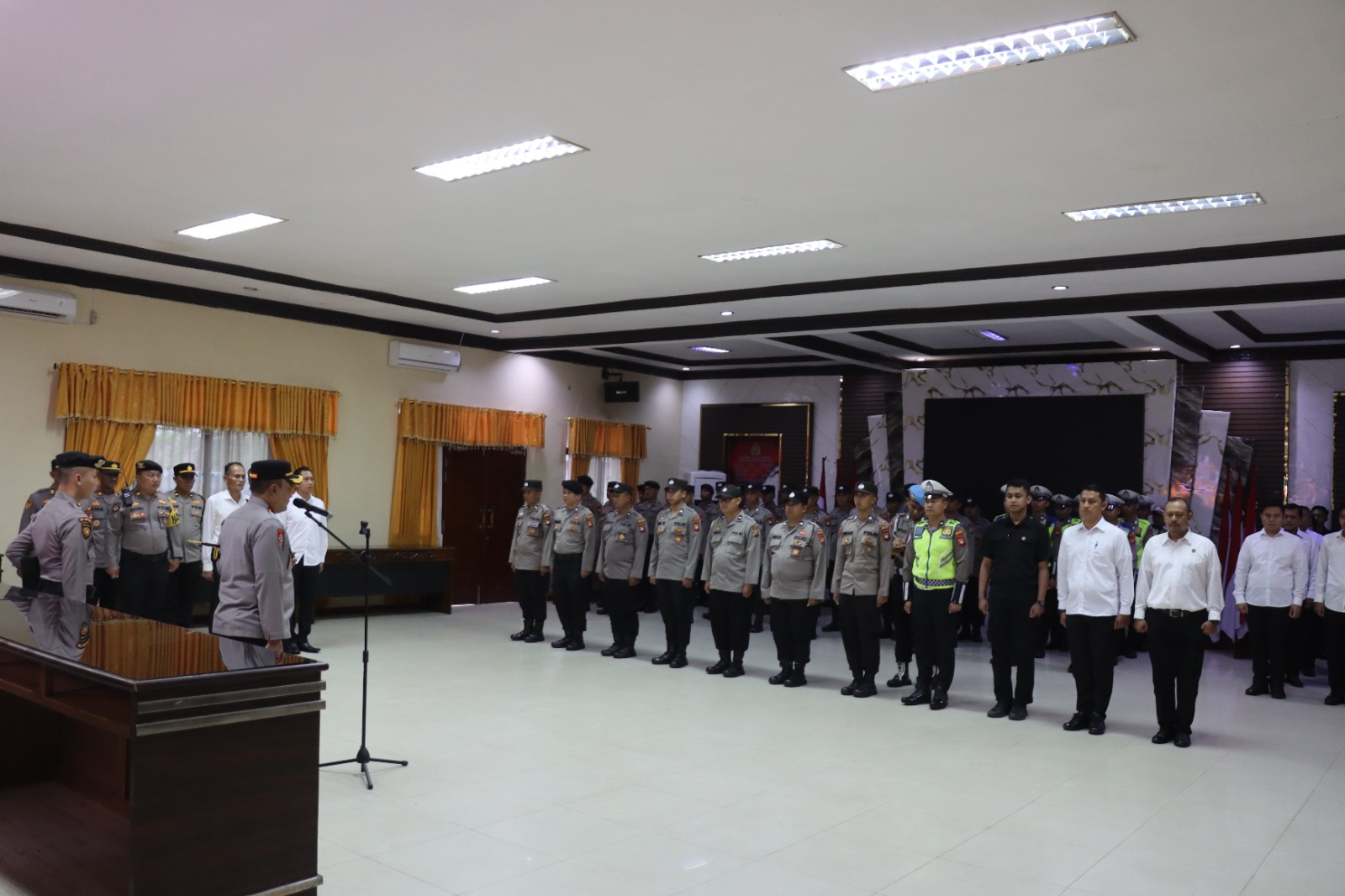 Polres Melawi Polda Kalbar – Kapolres Melawi Polda Kalbar AKBP Harris Batara Simbolon, S.I.K., S.H., M.Tr.Opsla menegaskan kepada personelnya tentang kedisiplinan dalam tugas dan terus mendukung program pemerintah saat pelaksanaan apel pagi di Aula Tribrata, Senin (16/3/26).