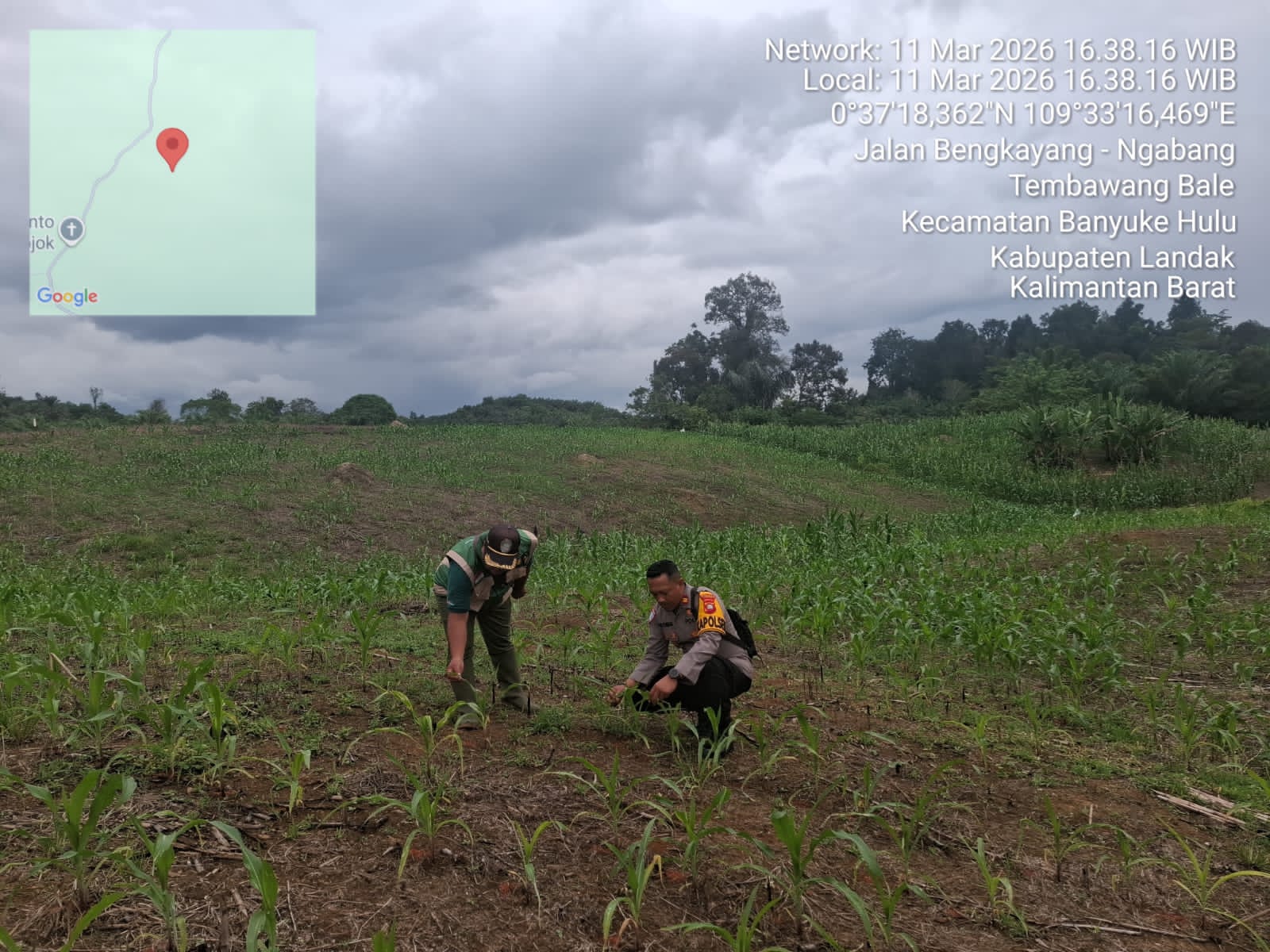 POLRES LANDAK – MENYUKE, POLDA KALBAR, Kegiatan Pengecekan Tanaman Jagung Ke Desa Ringo Lojok pada hari Rabu tanggal 11 Maret 2026, sekitar pukul 16.00 wib, bertempat di lahan milik Bapak Konda di Dusun Peluntan Desa Ringo Lojok Kecamatan Banyuke Hulu Kabupaten Landak.