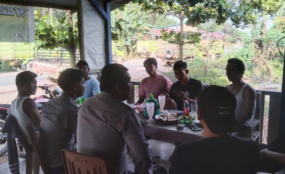 Kapospol Simpang 4 Kayu Lapis, Bripka Narto Suyanto, berdialog dengan para sopir truk yang sedang beristirahat di sebuah warung dekat pos polisi pada Senin (10/2/2025). Dalam suasana yang akrab, ia menyampaikan imbauan tentang pentingnya keselamatan berlalu lintas serta bijak dalam menggunakan media sosial.