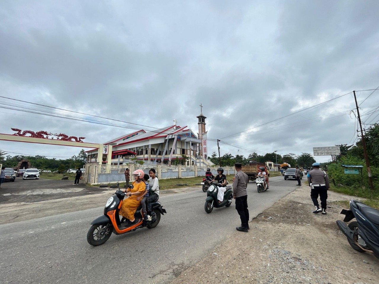Sejak pukul 08.00 WIB, personel telah berjaga di sekitar area gereja yang berlokasi di Jalan Merdeka Barat, Desa Sungai Ringin, Kecamatan Sekadau Hilir. Petugas tidak hanya fokus pada pengamanan di gereja, tetapi juga turut mengatur lalu lintas di sekitar area gereja untuk menjamin kenyamanan jemaat yang datang maupun kembali dari tempat ibadah.