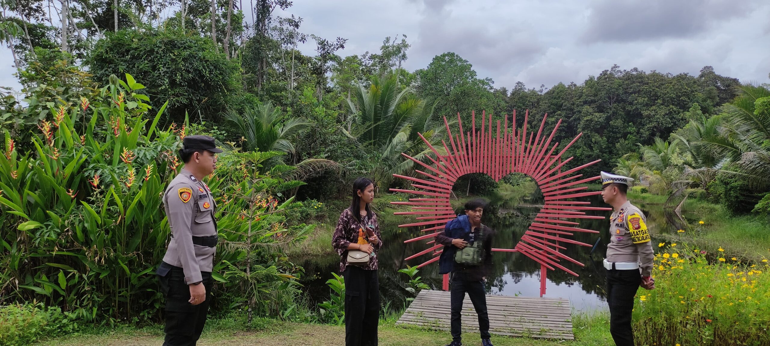 Personel Pos Pengamanan (Pos Pam) Operasi Ketupat Kapuas Polres Sekadau yang bertugas di Pospol Simpang 4 Kayu Lapis melaksanakan patroli di Objek Wisata Taman Kelempiau, Dusun Tapang Sambas, Desa Tapang Semadak, Kecamatan Sekadau Hilir, Kamis (3/4/2025).