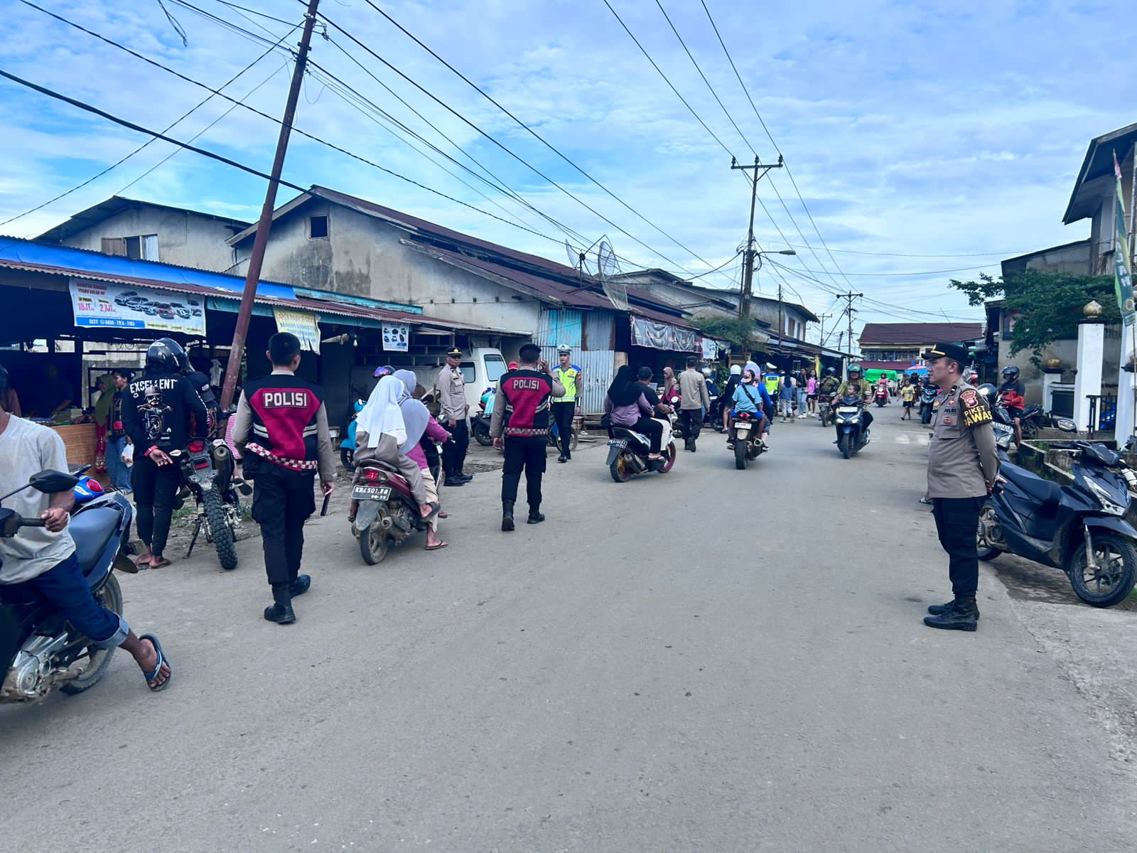Selain pengamanan terbuka, personel melakukan pengaturan lalu lintas di sekitar area pasar untuk mencegah kemacetan akibat parkir sembarangan dan penumpukan kendaraan menjelang azan Magrib.