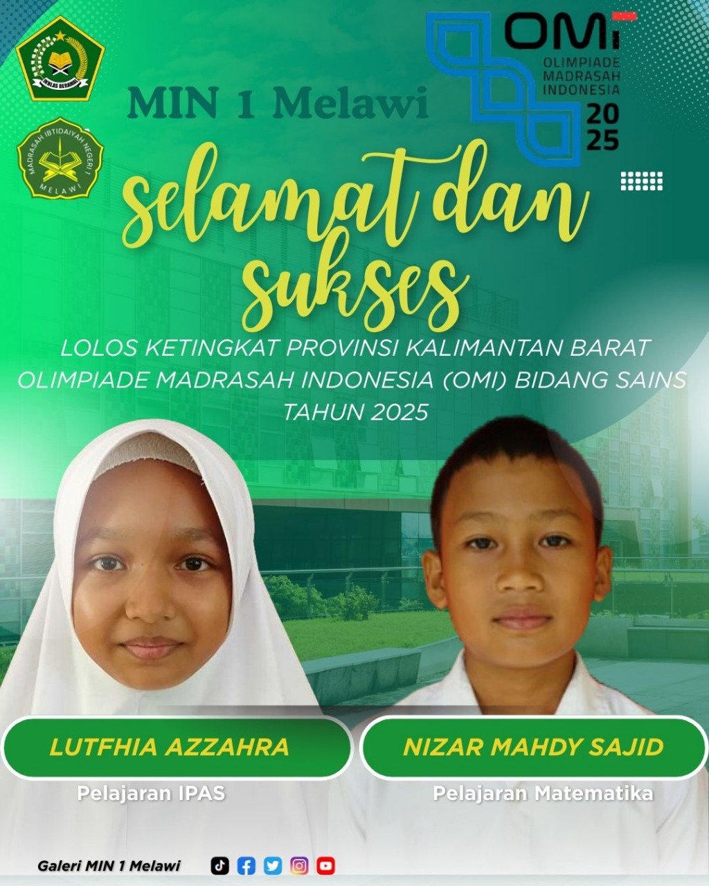 Madrasah Ibtidaiyah Negeri (MIN) 1 Melawi kembali menorehkan prestasi gemilang dalam ajang Olimpiade Madrasah Indonesia (OMI) 2025 tingkat Kabupaten. Dalam kegiatan yang diselenggarakan oleh Kementerian Agama di Madrasah Tsanawiyah Negeri (MTSN) 2 dua, Kabupaten Melawi, pada tanggal 10 September 2025 lalu, dua siswa MIN 1 Melawi berhasil meraih juara di bidang masing-masing.