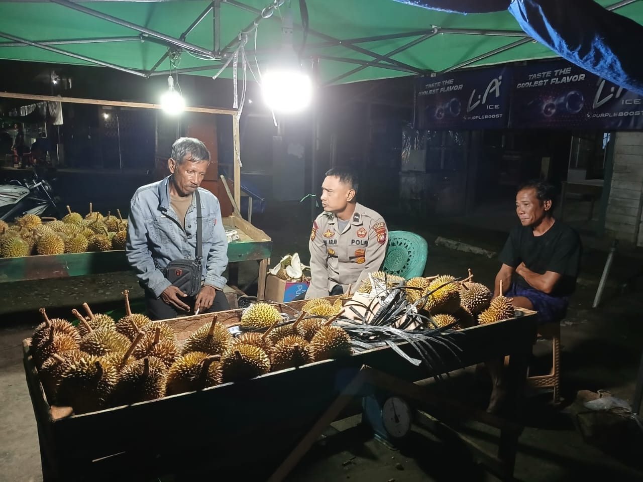 Dalam kegiatan tersebut, polisi tidak hanya melakukan pemantauan situasi keamanan, tetapi juga menyempatkan diri bersilaturahmi dengan para penjual durian yang masih beraktivitas hingga larut malam. Suasana akrab terlihat saat anggota polisi duduk bersama pedagang, berdialog santai sembari menyampaikan pesan-pesan kamtibmas.