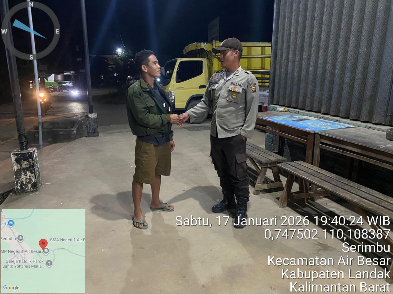 Polsek Air Besar ~ Polres Landak ~ Polda Kalbar ~ Kehadiran polisi di tengah masyarakat kembali terasa hangat dan humanis. Dalam kegiatan patroli malam, personel Polsek Air Besar tidak hanya berkeliling memantau situasi keamanan, namun juga menyempatkan diri duduk bersama warga, berbincang santai, serta menyapa masyarakat yang masih beraktivitas di malam hari.