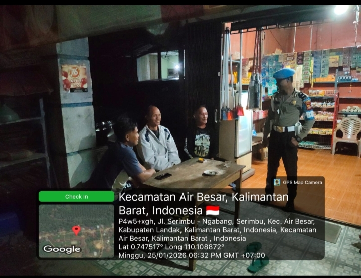 Polsek Air Besar ~ Polres Landak ~ Polda Kalbar ~ Wujud nyata kehadiran Polri di tengah masyarakat kembali ditunjukkan melalui patroli malam yang digelar jajaran Polsek Air Besar. Pada Minggu malam (25/1/2026), personel kepolisian menyambangi warga secara langsung dalam patroli dialogis, sekaligus memberikan himbauan kamtibmas demi menjaga keamanan dan ketertiban lingkungan.