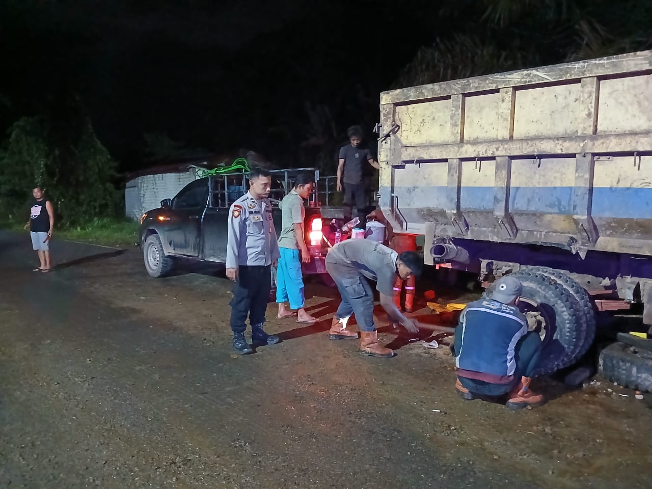 Melihat kondisi tersebut, petugas patroli segera menghentikan kendaraan dinas dan mendekati sopir truk untuk memastikan situasi aman serta memberikan bantuan. Selain membantu mengamankan lokasi agar tidak mengganggu arus lalu lintas, petugas juga menyempatkan diri menyampaikan imbauan kamtibmas dan pesan keselamatan berlalu lintas kepada sopir.