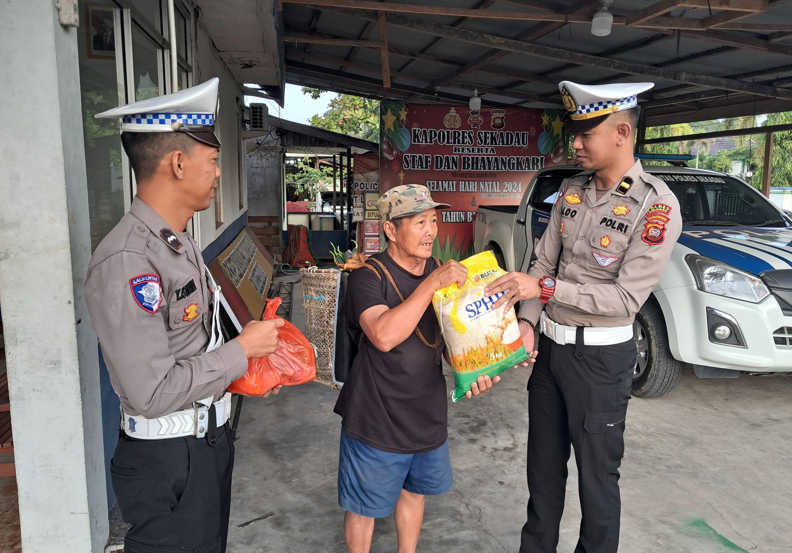 IPDA Aldo bersama anggota Satlantas Polres Sekadau kemudian menyerahkan paket sembako berisi beras, minyak goreng dan gula, sebagai bentuk dukungan terhadap perjuangan mereka dalam mencari nafkah.