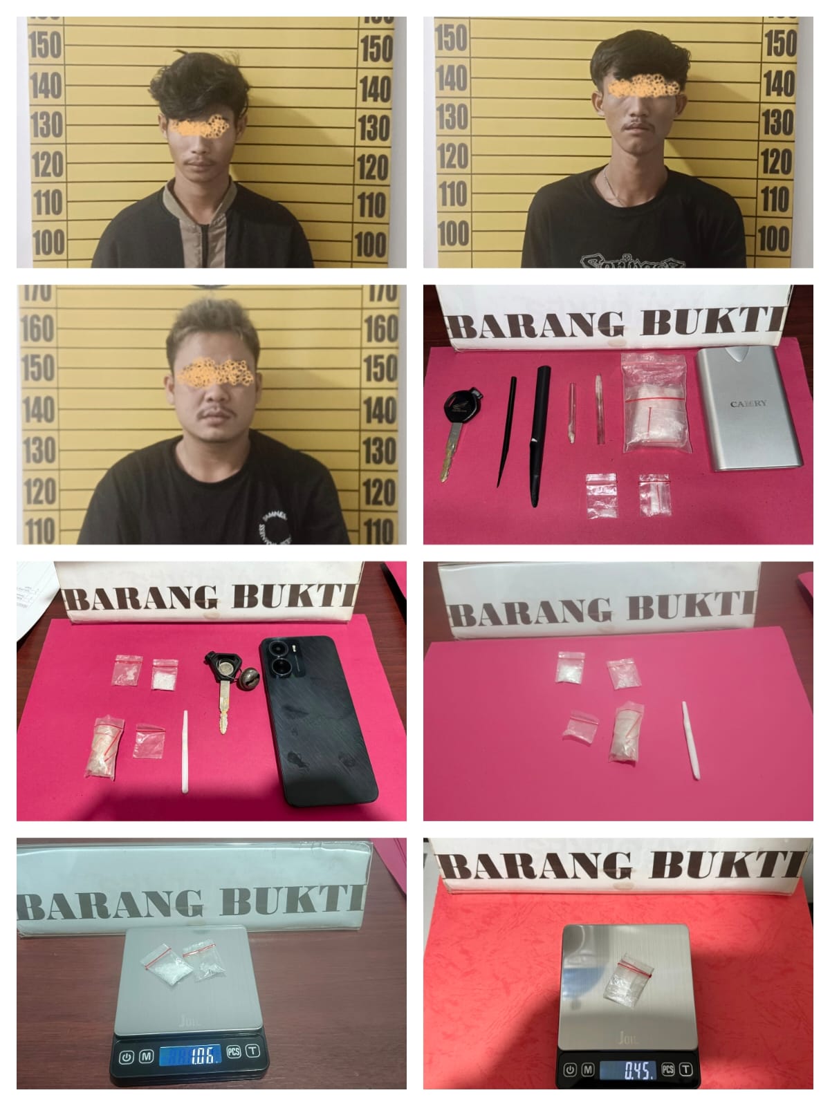 Saat dilakukan Penindakan terduga pelaku berinisial R dan G sedang mengendarai sepeda Motor Yamaha Aerox warna merah di jalan Gg. Bahtera Kemudian kedua tersangka dihentikan oleh personil Sat Resnarkoba kemudian dilakukan pengeledahan Badan dan pakaian terhadap kedua terduga pelaku dan terhadap terduga R ditemukan tepatnya disaku celana sebelah kanan 1 (satu) buah plastik klip transparan berisi Kristal diduga Narkotika jenis shabu berat bruto 1,06 (satu koma nol enam) gram dan ditemukan dalam saku jaket sebelah kanan 1 (satu) buah plastik klip transparan kosong dan 1 (satu) buah sendok terbuat dari potongan pipet warna putih dan ditemukan didalam saku jaket sebelah kiri 1 (satu) buah plastik klip transparan berisikan kantong klip kosong sedangkan terhadap terduga G ditemukan tepatnya ditangan sebelah kiri 1 (satu) unit handphone merk VIVO Y16 warna Stellar Black.