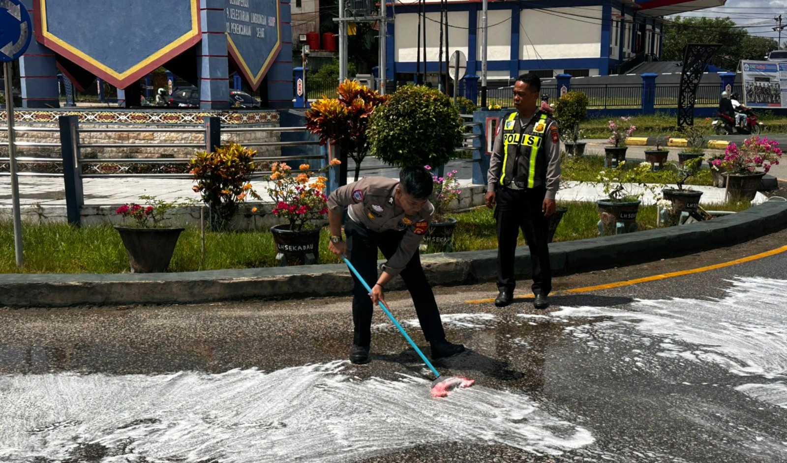 Di lapangan, personel melakukan pengamanan dan pengaturan arus lalu lintas agar kendaraan tetap dapat melintas dengan aman selama proses pembersihan berlangsung. Sejumlah anggota polisi juga turut membantu membersihkan area terdampak dengan menyapu dan menyiram permukaan jalan.