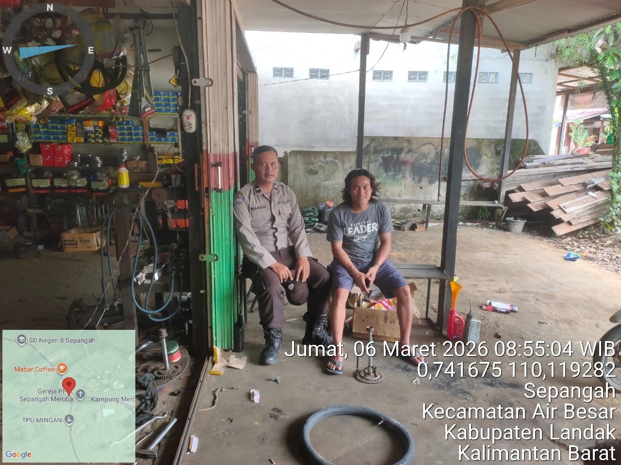 Polsek Air Besar ~ Polres Landak ~ Polda Kalbar ~ Suasana siang yang cukup terik tidak menyurutkan semangat aparat kepolisian untuk terus menjaga keamanan wilayah. Pada Jumat (6/3/2026), personel kepolisian melaksanakan patroli siang dan menyambangi sebuah bengkel yang sedang beroperasi. Kegiatan ini sekaligus dimanfaatkan untuk berdialog langsung dengan para karyawan bengkel serta memberikan imbauan terkait keamanan dan ketertiban masyarakat.