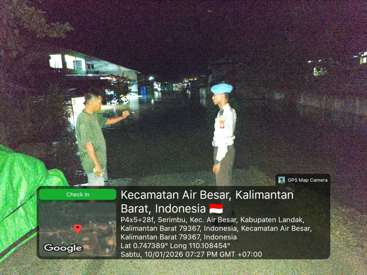 Pada Sabtu malam (10/1/2026), personel Polsek Air Besar melaksanakan patroli sekaligus pengecekan debit air di wilayah Kecamatan Air Besar, Kabupaten Landak. Dalam patroli tersebut, polisi tidak hanya memantau kondisi banjir, tetapi juga menyempatkan diri menyapa warga yang terdampak.