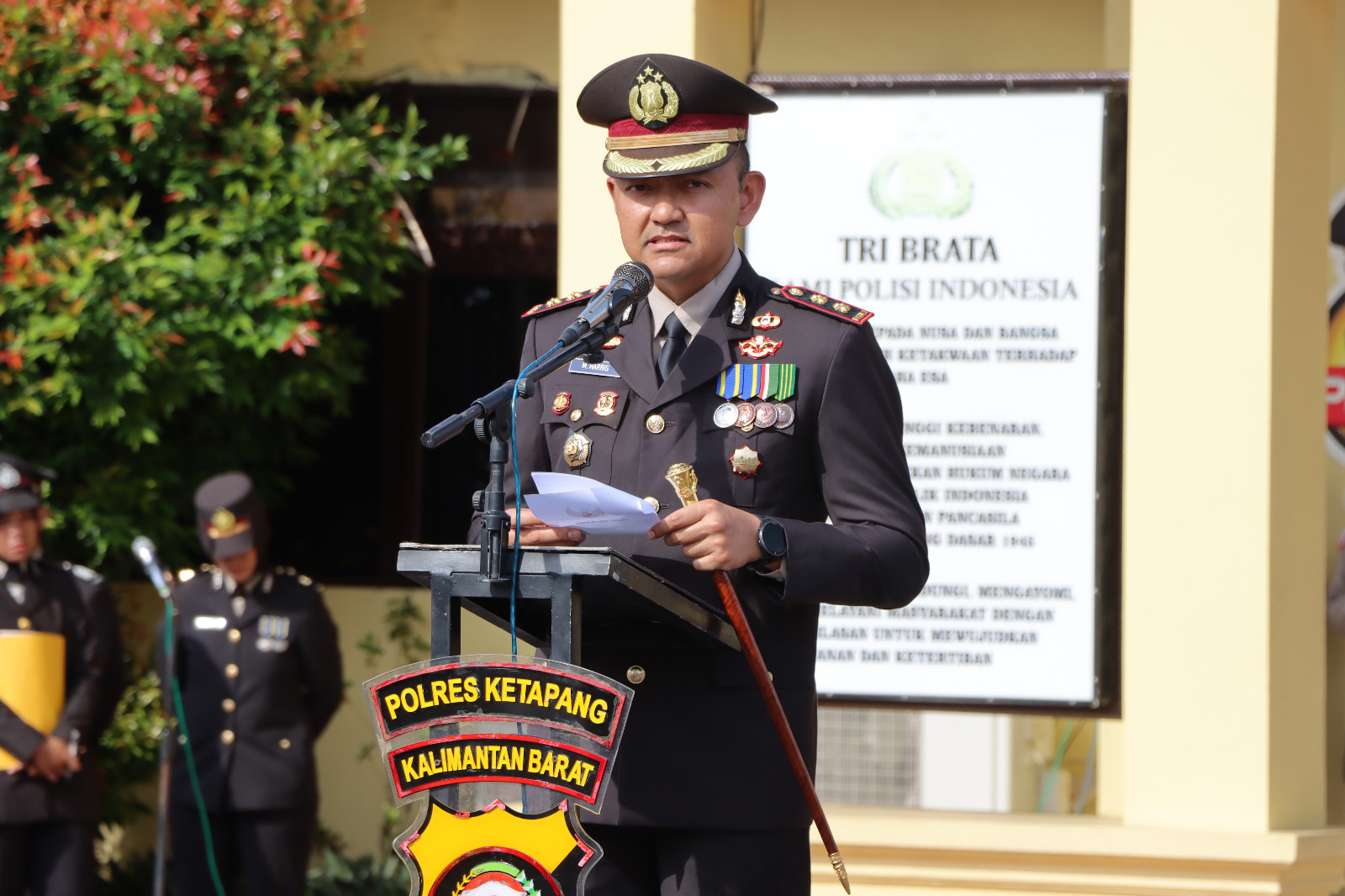 Kapolres Ketapang AKBP Muhammad Harris, S.H., S.I.K., M.I.K., CPHR. memimpin langsung jalannya upacara yang diikuti oleh para Pejabat Utama Polres, personel Polri,serta ASN Polres Ketapang.