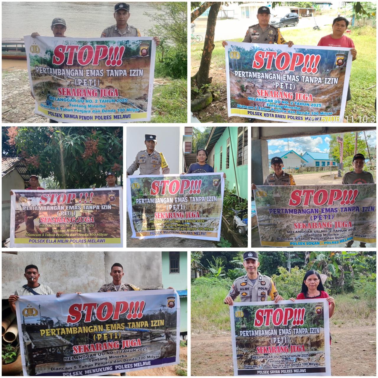 Polres Melawi Polda Kalbar – Pencegahan Pertambangan Emas Tanpa Ijin (PETI) terus dilakukan Polres Melawi dan Polsek jajaran dengan melakukan upaya STOP !!! Pertambangan Emas Tanpa Ijin melalui media spanduk yang langsung bertemu warga masyarakat, Senin (16/6/25).