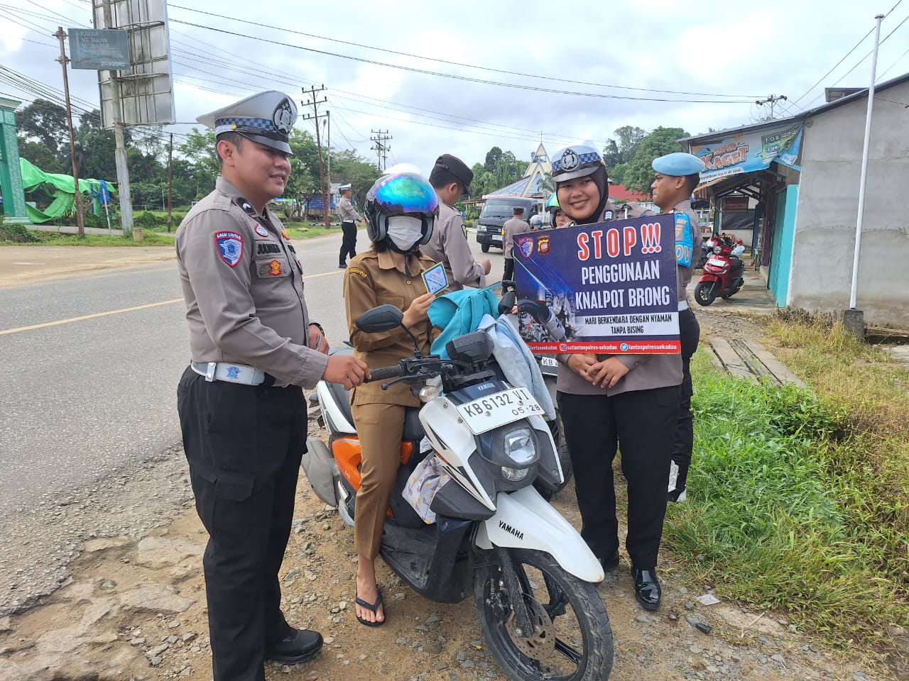 Personel Operasi Zebra Kapuas 2025 Polres Sekadau memberikan edukasi lalu lintas kepada masyarakat. Melalui handbanner bertuliskan “STOP Penggunaan Knalpot Brong, Mari Berkendara dengan Nyaman Tanpa Bising”, petugas menyampaikan imbauan kepada para pengendara bersamaan dengan pelaksanaan operasi.