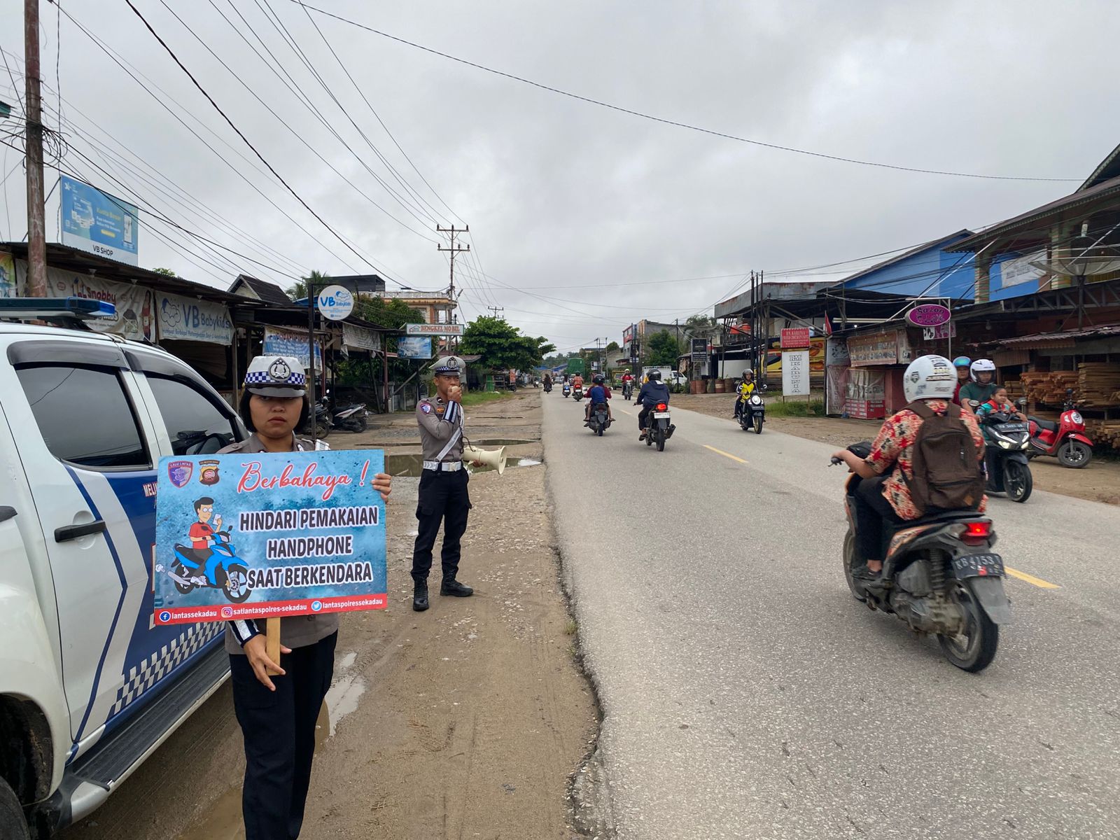 Untuk menarik perhatian dan memperkuat pesan keselamatan, petugas membawa hand banner bertuliskan “Berbahaya! Hindari Pemakaian Handphone Saat Berkendara.” Selain itu, imbauan juga disampaikan melalui pengeras suara, memastikan pesan keselamatan dapat diterima oleh seluruh pengguna jalan.