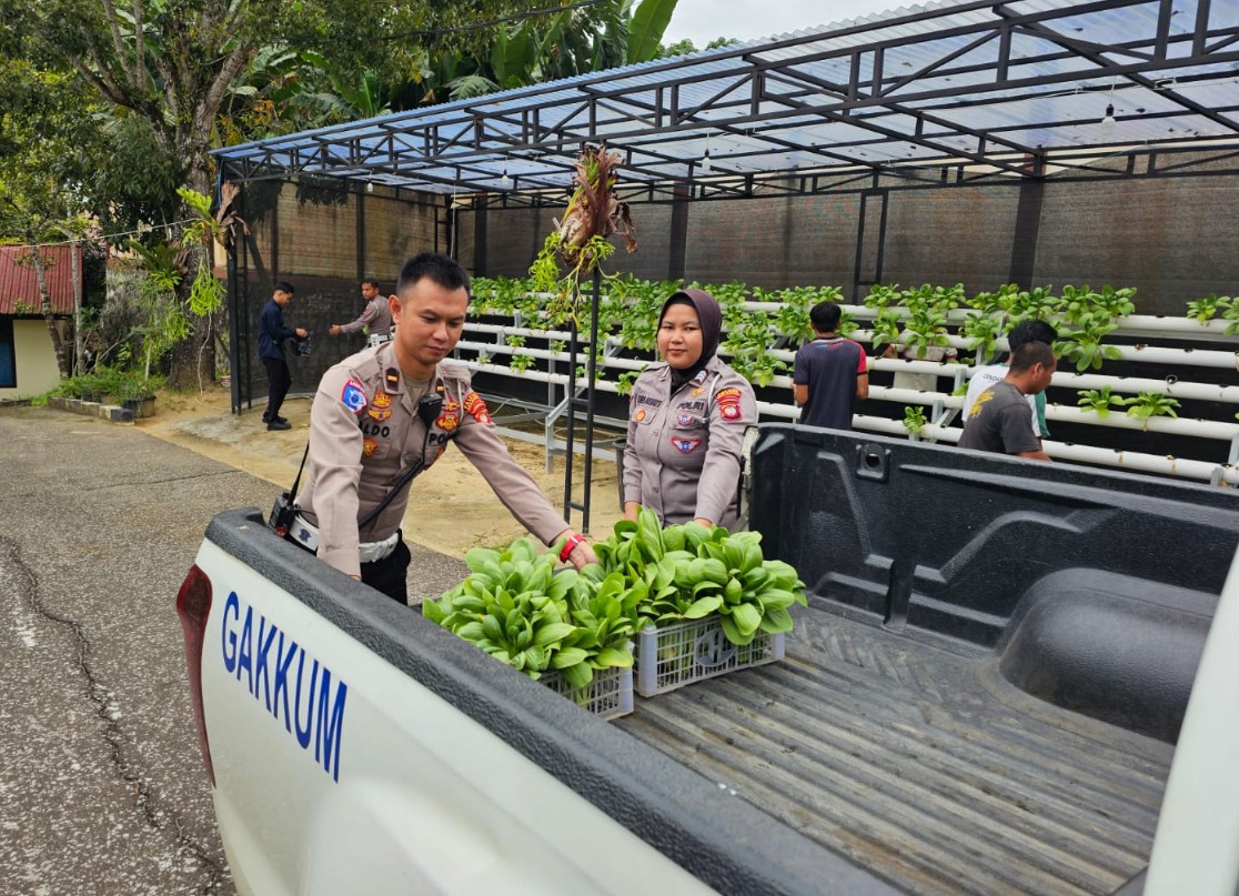 Polres Sekadau melalui Satuan Lalu Lintas memanen sayuran hidroponik jenis Pakcoy yang ditanam di lingkungan Mako Polres Sekadau dan membagikannya ke Pondok Pesantren Al Fatah, di Jalan Merdeka Timur, Km 4, Desa Mungguk, Kecamatan Sekadau Hilir, Rabu (25/6/2025).