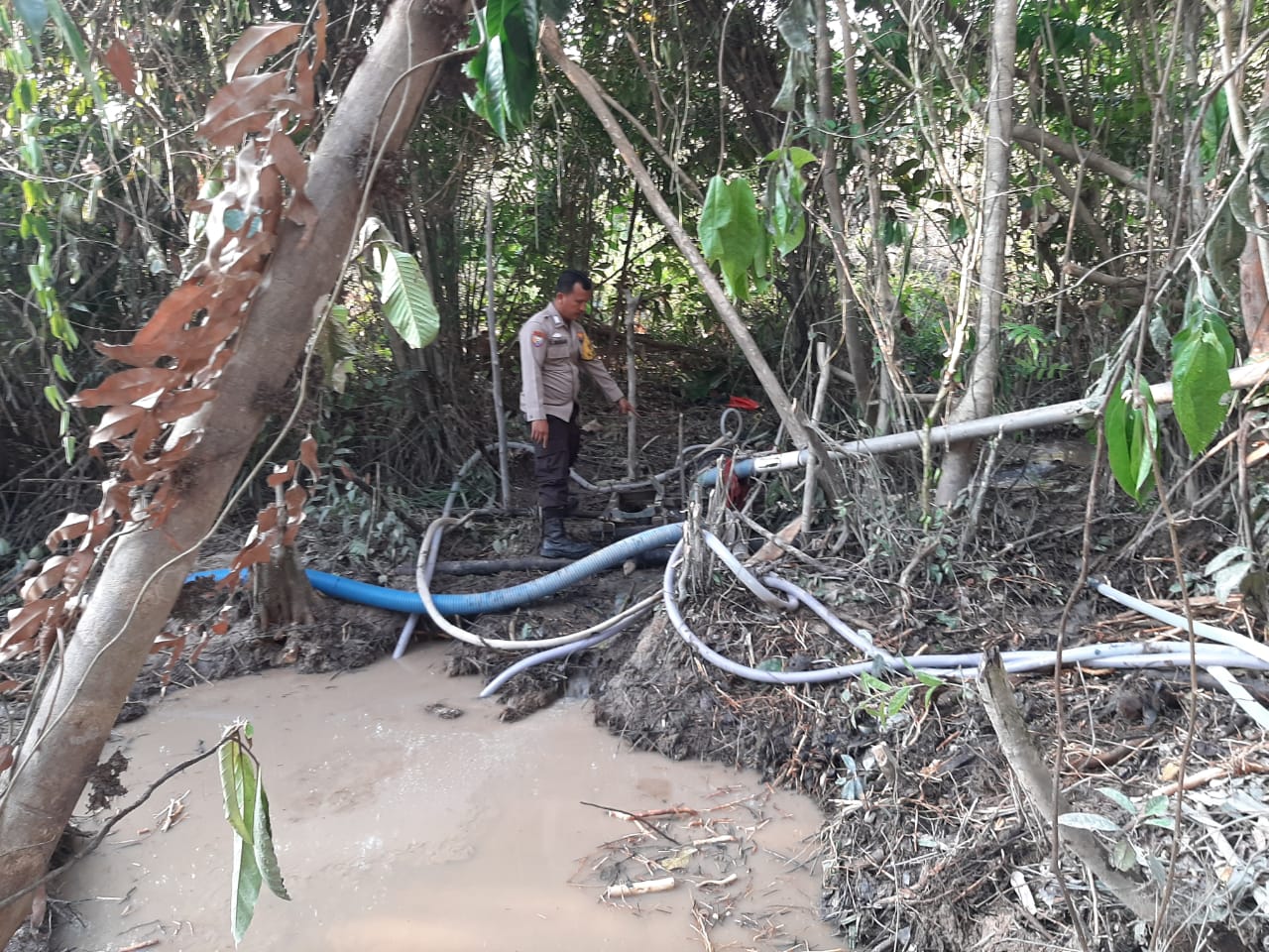 Polsek Mandor~ Polres Landak ~ Polda Kalbar ~Dalam upaya mencegah terjadinya Penambangan Emas Tanpa Izin (PETI) di wilayah hukum Polsek Mandor, Anggota Polsek Mandor bersama Kadus Kerohok melaksanakan kegiatan sambang dan himbauan kepada masyarakat. Karena adanya informasi dari masyarakat, aktivitas tersebut penggunaan mesin pompa dan selang besar untuk menyedot air dari sungai kecil di dalam hutan. Dalam pengecekan tersebut, petugas menemukan sejumlah instalasi pipa dan mesin yang masih aktif, diduga digunakan untuk mengalirkan air ke lokasi.
