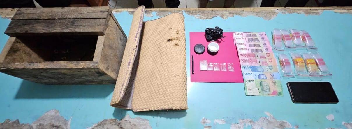 Barang bukti yang berhasil diamankan dari tangan pelaku antara lain: lima kantong plastik bening berisi diduga sabu-sabu dengan berat bruto 2,31 gram, delapan bundel plastik klip bening, satu kotak minyak rambut warna hitam, uang tunai sebesar Rp720.000, satu sendok pipet berwarna hitam, satu keset kaki, satu kotak kayu, dan satu unit telepon genggam merek Vivo warna hitam.