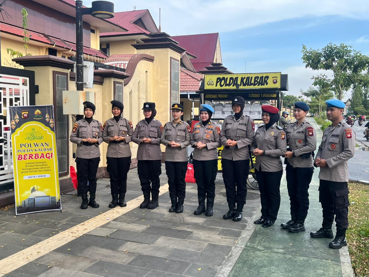 Polwan Polda Kalimantan Barat kembali menunjukkan kepedulian sosialnya dengan menggelar kegiatan pembagian takjil gratis kepada masyaraka di depan Mapolda Kalbar. Senin (2/3/2026)