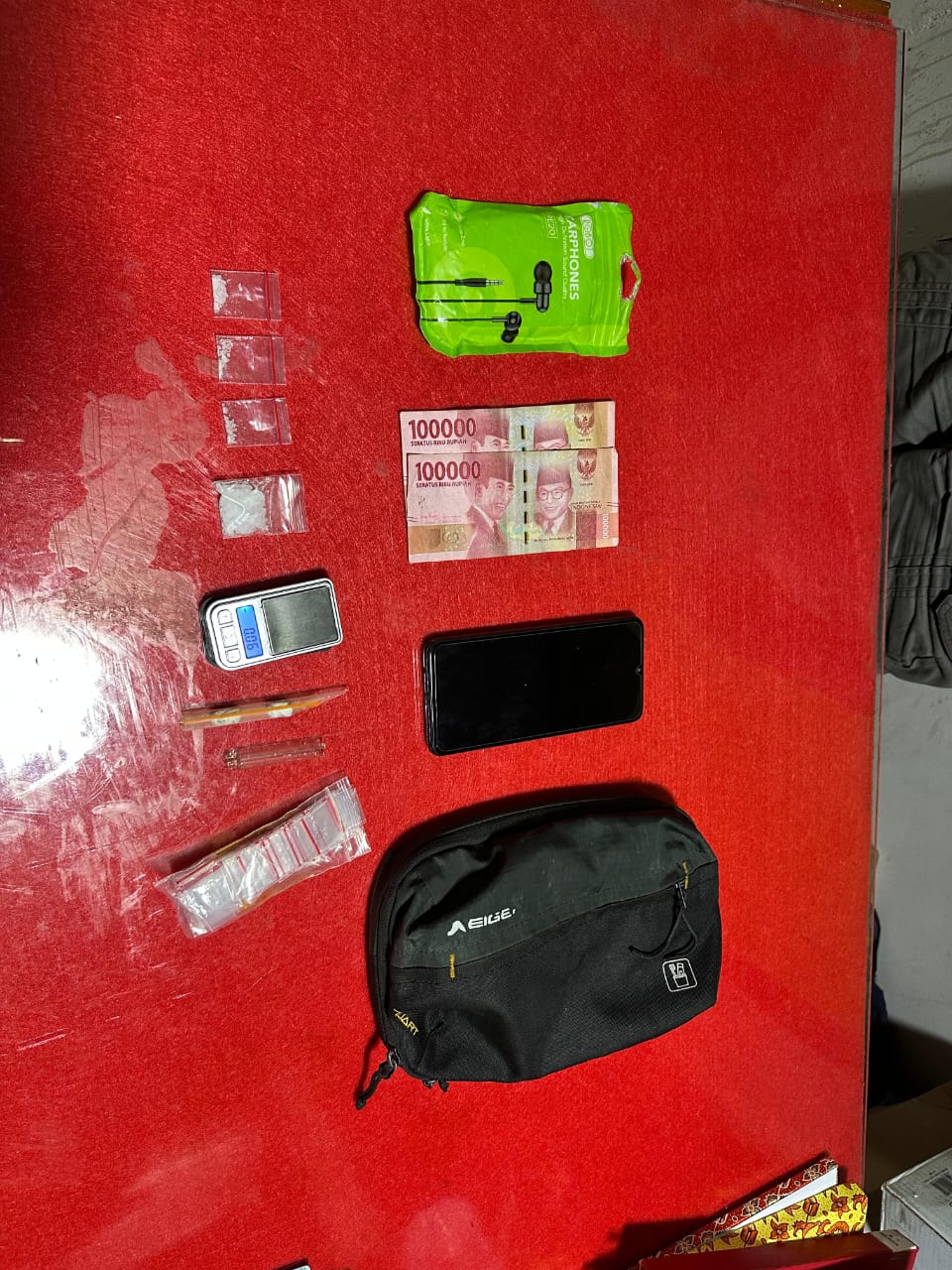 Benar saja, saat rumah digeledah dengan disaksikan juga oleh Perangkat Desa dan warga sekitar, didapati terduga pelaku IS sedang berada dalam kamar dan dirinya menguasai sejumlah barang bukti berupa beberapa kantong klip bening berisikan serbuk kristal diduga narkotika jenis sabu dengan berat total keseluruhan 2,65 gram bruto, 1 buah Sendok Sabu, 1 buah tas Merk EIGER warna hitam, 1 buah kaca fanbo, Uang Tunai sejumlah Rp. 200.000, dan 1 Unit Handphone Merk Samsung warna biru.