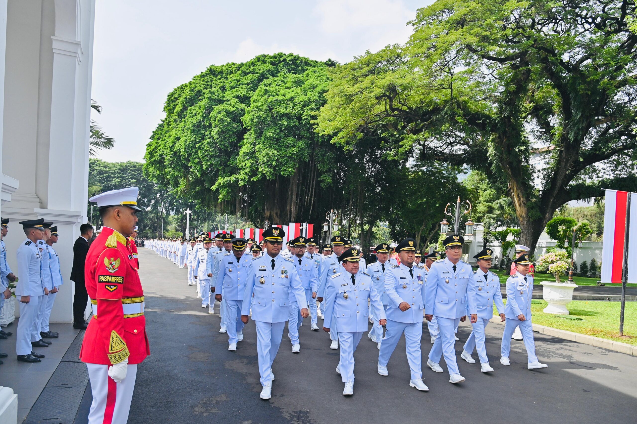 Prosesi kirab dimulai dari halaman Monas, tempat para kepala daerah berkumpul sebelum berjalan menuju Istana Kepresidenan. Barisan rapi para pemimpin daerah ini menjadi pemandangan yang menarik perhatian masyarakat dan tamu undangan yang turut menyaksikan momen bersejarah tersebut.