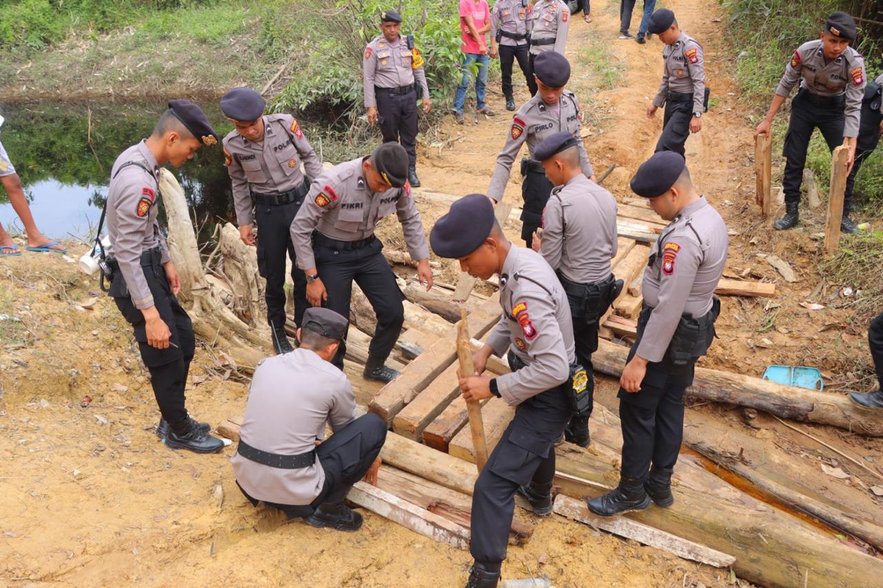 Dengan menggunakan material kayu yang tersebar di sekitar lokasi, para personel TNI-Polri tersebut dengan sigap membuat akses jalan menyerupai jembatan kecil.
