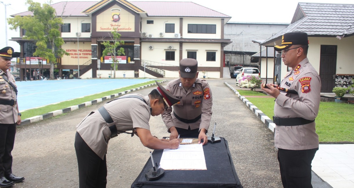 Kapolres Sekadau AKBP Donny Molino Manoppo, S.H., S.I.K., M.Si, memimpin upacara serah terima jabatan (sertijab) tiga Pejabat Utama (PJU) di Mapolres Sekadau, Selasa (9/9/2025).