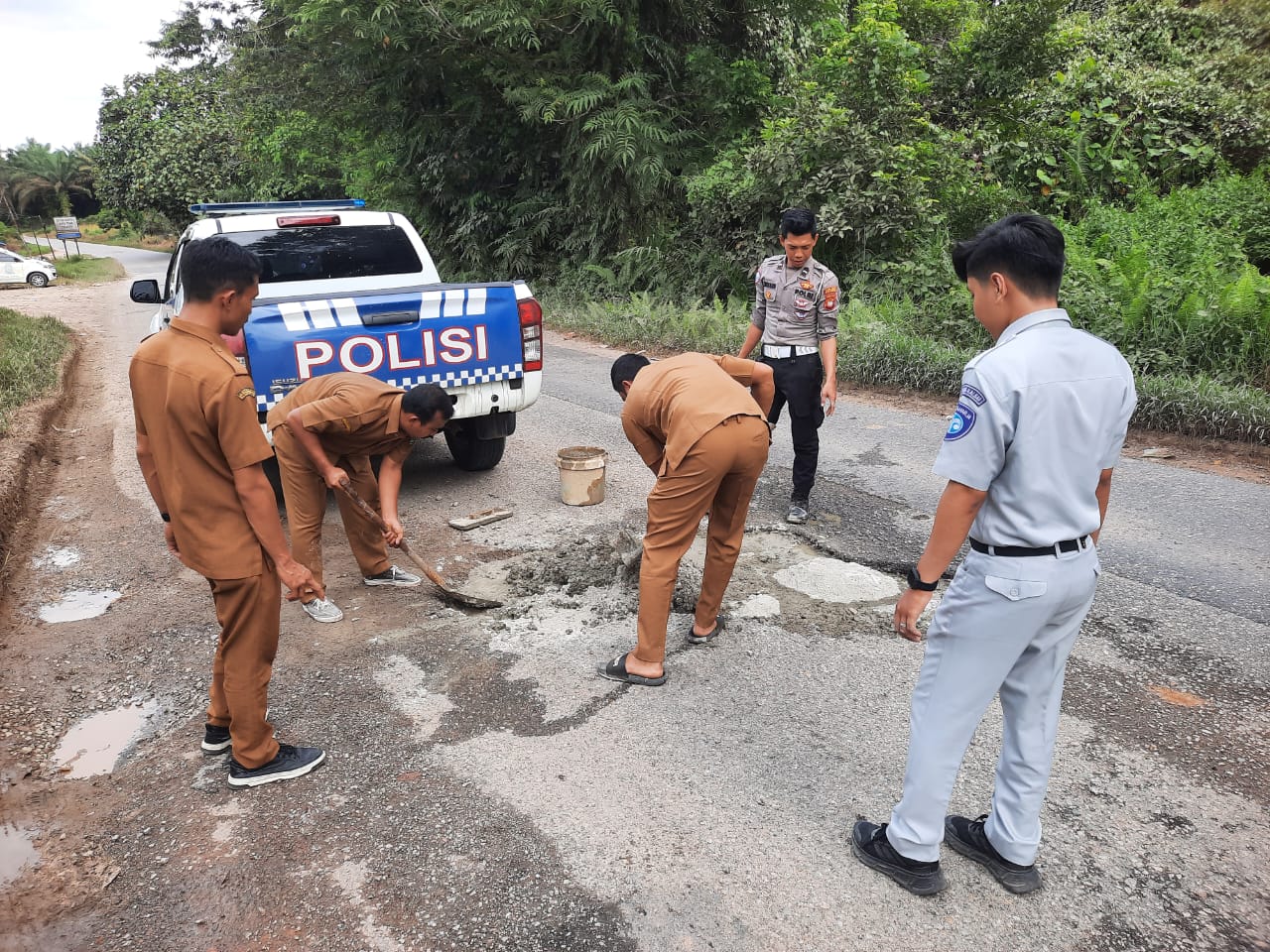 Satlantas Polres Sekadau bersama Jasa Raharja dan Pemerintah Desa Ensalang melakukan penambalan jalan berlubang di Jalan Sekadau – Sanggau Km 10, Desa Ensalang, Kecamatan Sekadau Hilir, pada Selasa (11/2/2025).