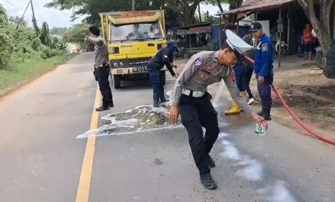Satlantas Polres Sekadau bersama Dinas Damkar Kabupaten Sekadau melakukan pembersihan tumpahan solar di Jalan Merdeka Timur, dekat BTN AMS, Desa Mungguk, Kecamatan Sekadau Hilir, Jumat (15/8/2025).