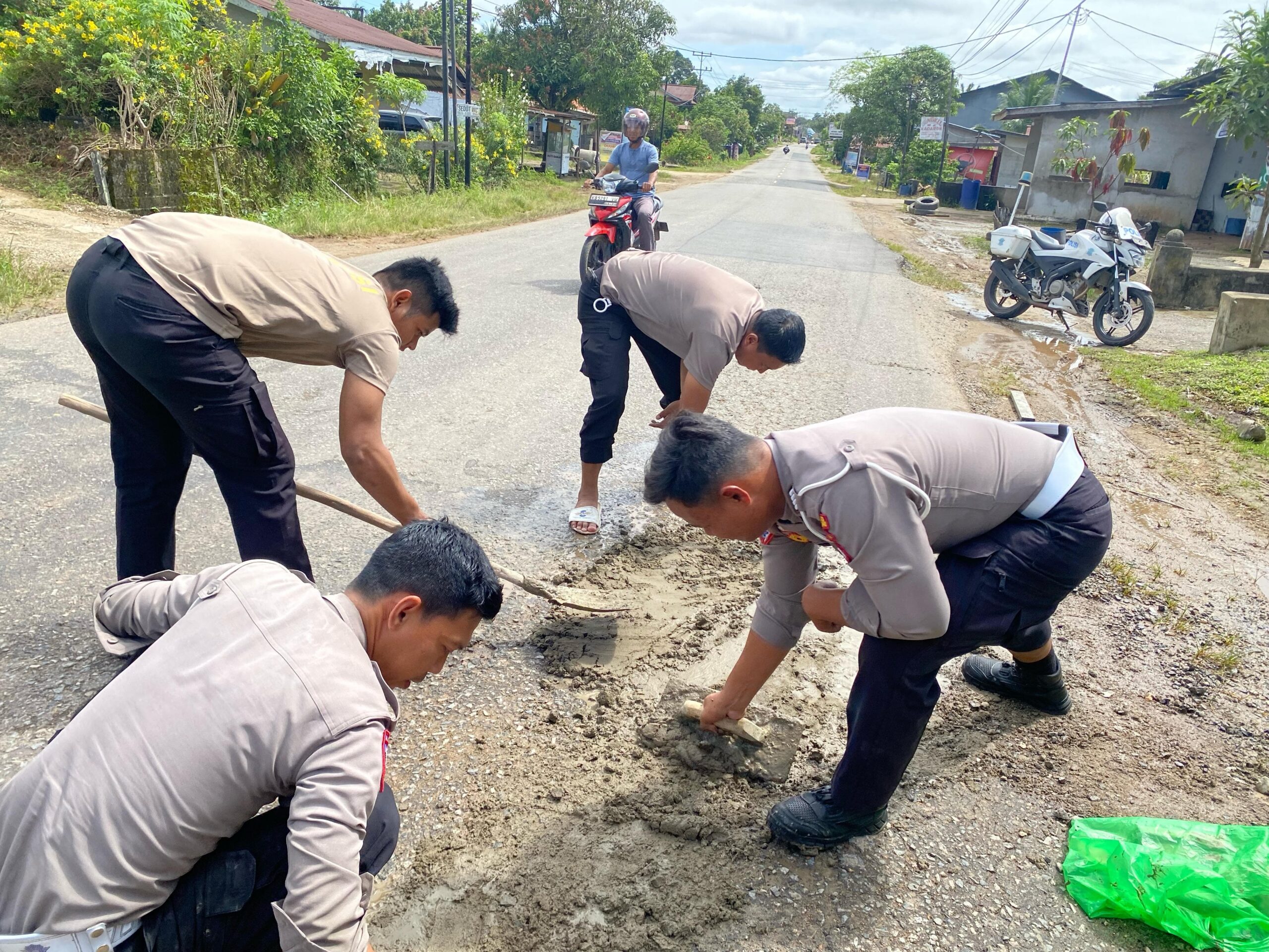 Kapolres Sekadau AKBP I Nyoman Sudama, melalui Kanit Turjagwali Satlantas Polres Sekadau IPDA Alexander Aldo menjelaskan bahwa personel Satlantas turun langsung ke lokasi dengan membawa material semen menggunakan mobil patroli untuk menambal lubang yang ada.