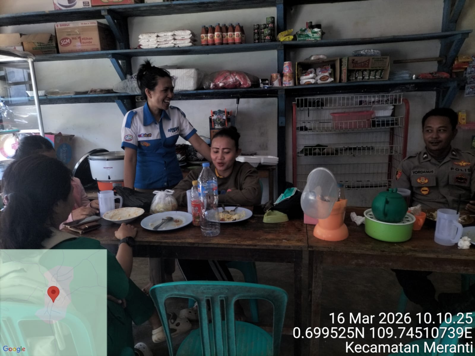 Polsek Meranti ~ Polres Landak ~ Polda Kalbar ~ Suasana santai di sebuah warung makan di wilayah Kecamatan Meranti dimanfaatkan anggota kepolisian untuk menyampaikan pesan kamtibmas kepada masyarakat. Dengan pendekatan humanis dan penuh keakraban, polisi berdialog langsung bersama warga yang sedang beristirahat dan menikmati makanan.