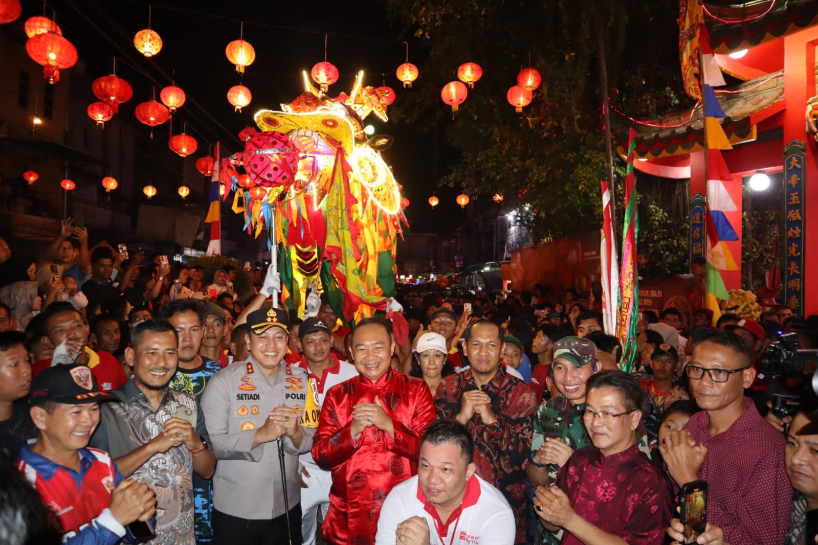 Kegiatan tersebut diwarnai dengan berbagai pertunjukan seni dan budaya, seperti barongsai, tarian tradisional, dan pertunjukan aksi naga yang turut memeriahkan suasana malam itu. Warga yang hadir terlihat antusias menyaksikan setiap pertunjukan, sementara jajaran kepolisian dan aparat setempat menjaga keamanan acara agar tetap berjalan dengan lancar.